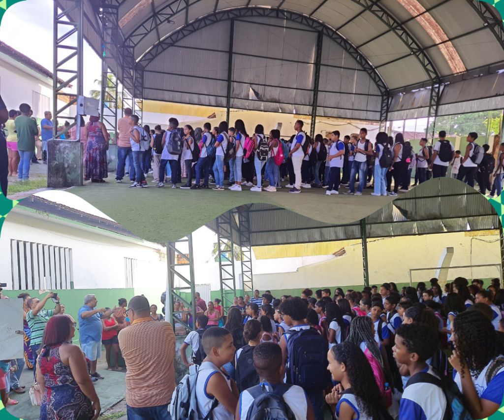 Fundacao Educacional Pedro Calmon recebe alunos com ato cívico e muita alegria no início do ano letivo em Belmonte.