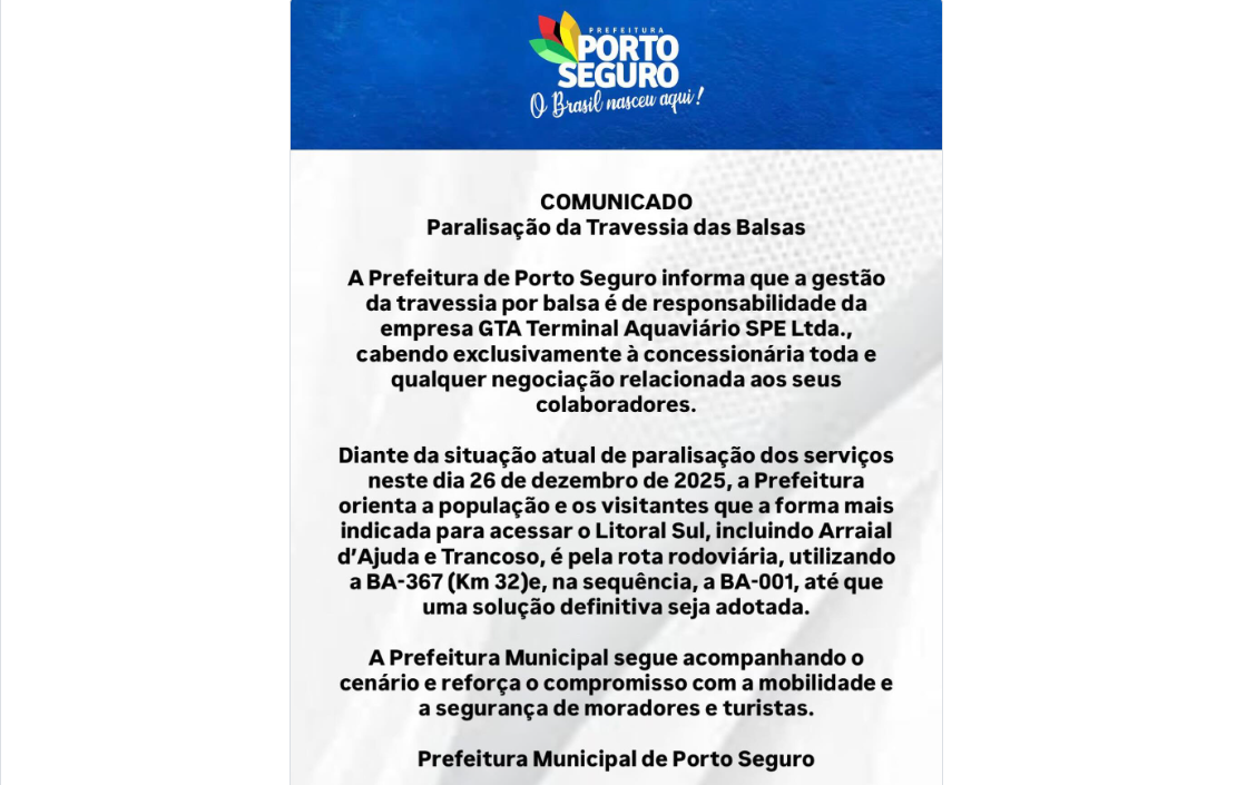 Paralisação das balsas: Prefeitura de Porto Seguro emite nota e orienta motoristas a usarem rota alternativa.