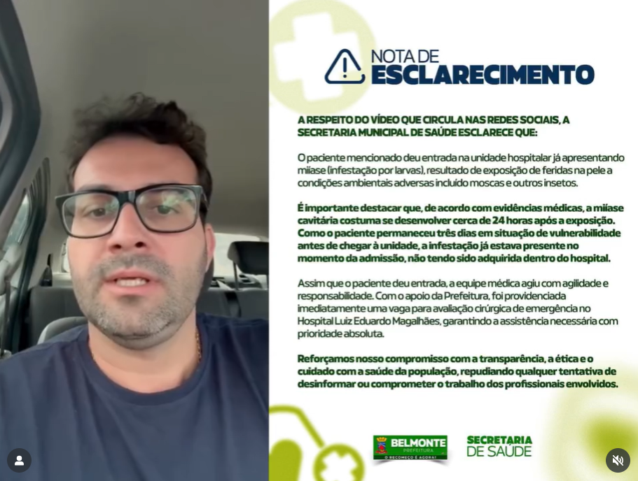 Secretaria de Saúde de Belmonte esclarece vídeo de paciente com larvas no rosto.